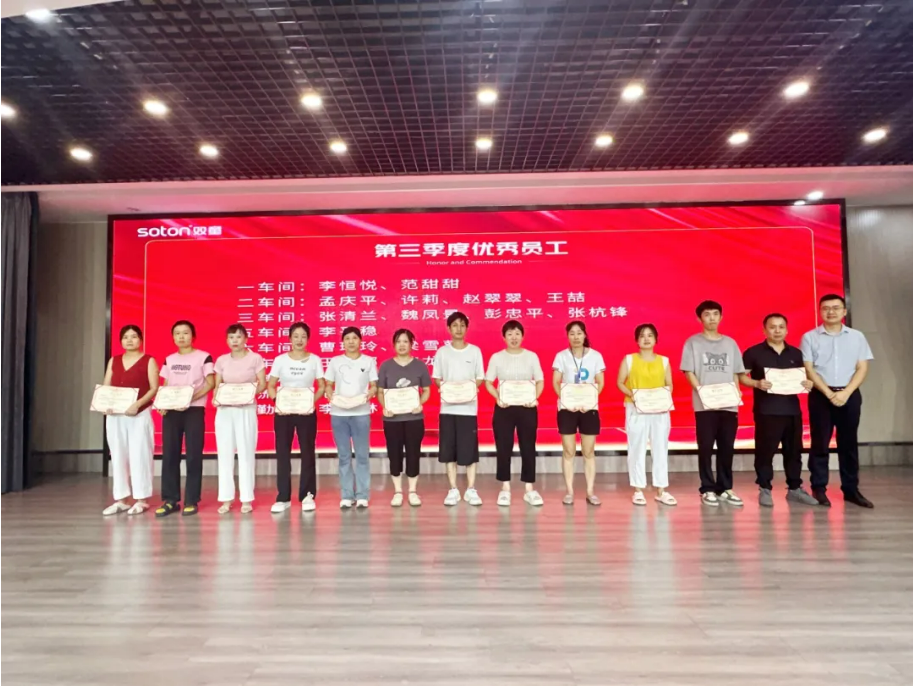 大會首項便是表彰2025年第三季度優(yōu)秀員工。經層層評選,共有18位來自公司各崗位的杰出同仁脫穎而出,榮獲此項稱號。他們之中,既有扎根生產一線、精益求精的技術能手;也有堅守后勤崗位、默默耕耘的服務標兵。雖崗位不同,職責各異,但他們都以同樣的匠心與熱忱,在平凡的日常中鑄就不凡,成為雙童奮斗者群像中閃亮的縮影。