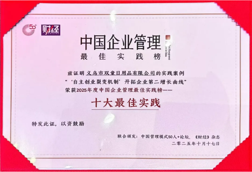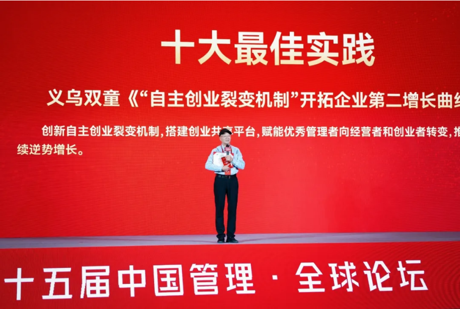 作為本屆論壇的重要成果,首屆“中國企業(yè)管理最佳實踐榜”正式揭曉,雙童以《"自主創(chuàng)業(yè)裂變機制"開拓企業(yè)第二增長曲線》案例從數(shù)百個申報案例中脫穎而出,榮獲“十大最佳實踐” 獎項!現(xiàn)場頒獎詞寫道:雙童憑借“自主創(chuàng)業(yè)裂變機制”,劃小經(jīng)營單元孵化16家創(chuàng)業(yè)體,開拓企業(yè)第二增長曲線,為中小企業(yè)組織激活提供了鮮活樣板!