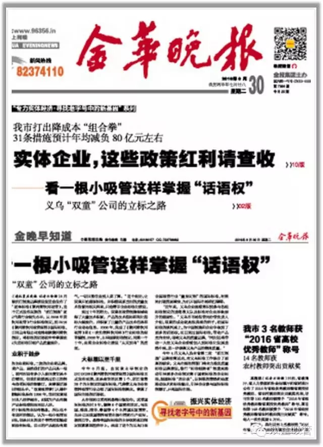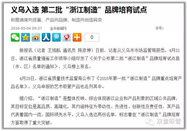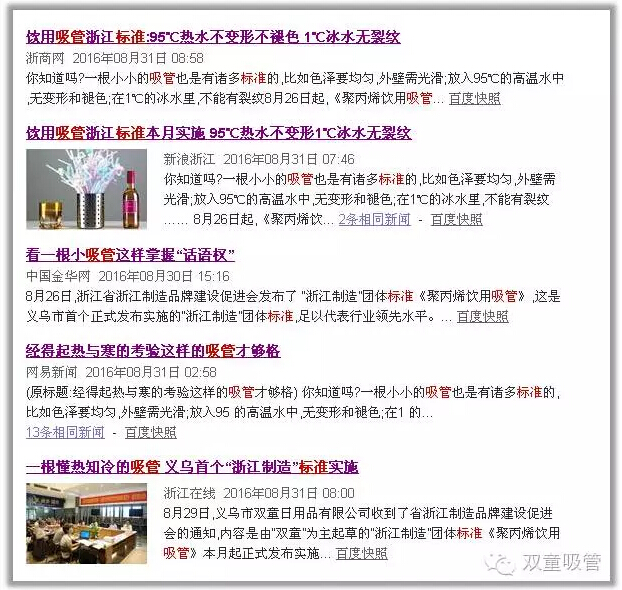 近日,由“雙童”主導(dǎo)起草的“浙江制造”團(tuán)體標(biāo)準(zhǔn)《聚丙烯飲用吸管》正式發(fā)布實(shí)施!這是義烏市首個(gè)正式發(fā)布實(shí)施的“浙江制造”團(tuán)體標(biāo)準(zhǔn),一時(shí)間引起了各大媒體的關(guān)注,《錢江晚報(bào)》、《金華晚報(bào)》、《義烏商報(bào)》、新浪、網(wǎng)易、浙江在線等媒體都在爭(zhēng)先報(bào)道這一大好消息!