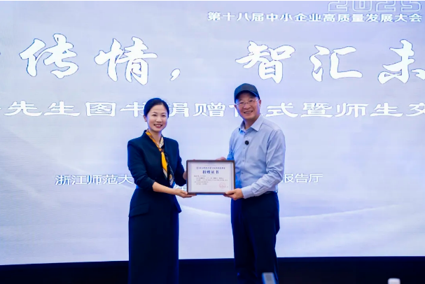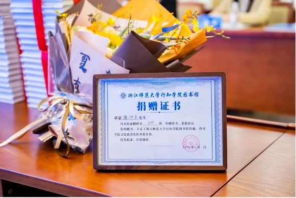 頒獎儀式結(jié)束后,浙江師范大學(xué)行知學(xué)院舉行了“書香傳情,智匯未來”圖書捐贈儀式。儀式上,學(xué)院圖書館館長吳建軍、浙江師范大學(xué)行知學(xué)院副院長蔣芬君共同代表學(xué)校,接受樓仲平捐贈的300本個人自傳《韌商》,并向他頒發(fā)捐贈證書。校方表示,這些書籍將部分上架供師生借閱,部分用于院史館展出和地方特藏庫珍藏,以期充分發(fā)揮其傳播與珍藏價值。一時間,現(xiàn)場掌聲如潮,氣氛熱烈。