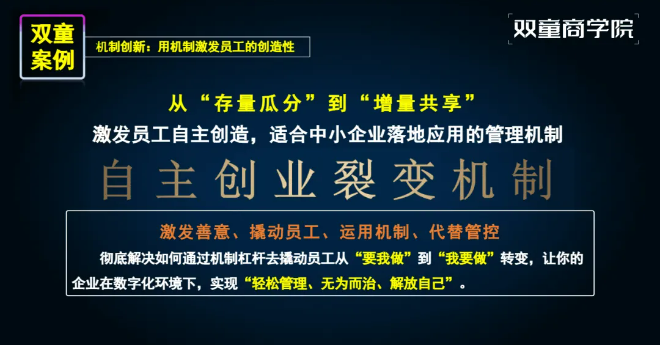 如今,歷經(jīng)數(shù)年實(shí)踐,雙童自主創(chuàng)業(yè)裂變機(jī)制已日趨完善,通過(guò)資源配置和分配機(jī)制的創(chuàng)新,幫助企業(yè)實(shí)現(xiàn)了與員工間從存量瓜分博弈到增量共享的轉(zhuǎn)變。
