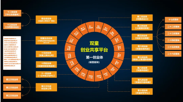 2018年,他創(chuàng)建“雙童創(chuàng)業(yè)共享平臺(tái)”,鼓勵(lì)員工內(nèi)部創(chuàng)業(yè),從“打工者”變?yōu)椤昂匣锶恕?。至今已孵?6個(gè)創(chuàng)業(yè)體26個(gè)員工自主經(jīng)營(yíng)體,形成了裂變式生長(zhǎng)的創(chuàng)新生態(tài)。