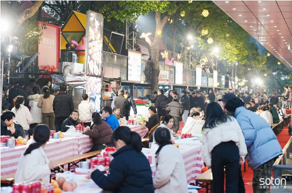 現(xiàn)場處處洋溢著溫馨與歡樂:烤串在爐火上滋滋作響,孜然香氣隨風(fēng)飄散;鹵味攤前始終人氣不減,鴨頭酥香、炒粉鍋氣十足,讓人吃得暢快淋漓。甜品區(qū)則是孩子們的樂園,切糕扎實(shí)、蛋糕綿密,一張張小臉上寫滿了滿足。長桌上,從梅干菜餅到牛肉飯,天南地北的美食在此匯聚,笑語與食物的熱氣一同在林間縈繞,繪成一幅溫暖生動的歲末歡聚圖景。