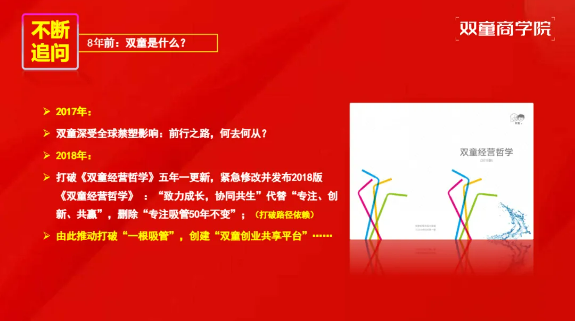 《雙童經(jīng)營哲學(xué)》是在持續(xù)追問中逐漸成形的,雙童創(chuàng)始人樓仲平認為,人類與企業(yè)的成長皆源于解決問題,是問題倒逼思考與進化。