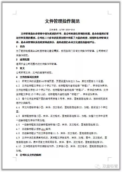 通過這份文件,我們統(tǒng)一了企業(yè)文件的編寫要求,從而明確指導(dǎo)各部門在形成、修訂、補(bǔ)充和更新文件時的統(tǒng)一規(guī)范!換句話說,無論是“雙童”多少位科室員工寫的文件,打開一看都像是一個人寫的文件!
