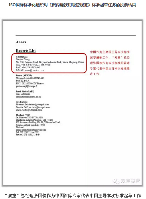 通過四年時(shí)間的努力,ISO國(guó)際標(biāo)準(zhǔn)化組織于2012年6月8日對(duì)《聚丙烯飲用吸管規(guī)范》ISO國(guó)際標(biāo)準(zhǔn)的起草編制工作進(jìn)行投票表決,并以三分之二的絕對(duì)多數(shù)獲得通過,并批準(zhǔn)以中國(guó)、泰國(guó)、瑞典、法國(guó)、南非5國(guó)組成的《聚丙烯飲用吸管規(guī)范》國(guó)際標(biāo)準(zhǔn)起草委員會(huì),“雙童”作為當(dāng)時(shí)全球最專業(yè)的吸管制造企業(yè)被推舉為本項(xiàng)國(guó)際標(biāo)準(zhǔn)的起草主席國(guó)以推進(jìn)本項(xiàng)標(biāo)準(zhǔn)的起草編制工作。