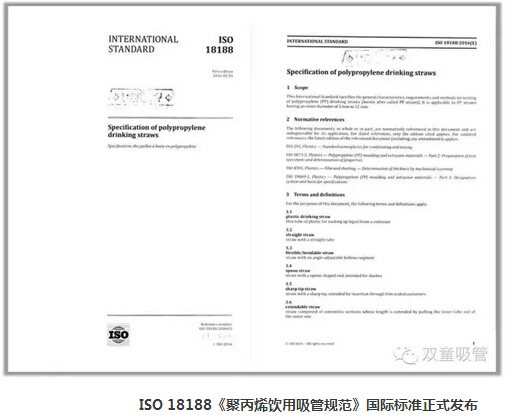 2016年6月27日,瑞士ISO標(biāo)準(zhǔn)化管理組織正式向全球162個(gè)成員國(guó)下發(fā)了《聚丙烯飲用吸管規(guī)范》ISO國(guó)際標(biāo)準(zhǔn)文本。至此,歷經(jīng)九年,輾轉(zhuǎn)六國(guó),由“雙童”代表中國(guó)主持起草的《聚丙烯飲用吸管規(guī)范》ISO國(guó)際標(biāo)準(zhǔn)終于大功告成!標(biāo)準(zhǔn)起草編制工作圓滿完成。