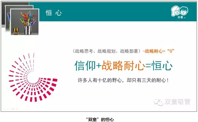 我們強(qiáng)調(diào)戰(zhàn)略思考、戰(zhàn)略規(guī)劃、戰(zhàn)略部署,唯獨(dú)缺少戰(zhàn)略耐心。“恒心”是信仰加上戰(zhàn)略耐心。創(chuàng)新就是改變,就是持續(xù)積累。創(chuàng)新需要戰(zhàn)略耐心,需要十年為一個(gè)單位的恒心。“雙童”其實(shí)很簡單,知道自己應(yīng)該放棄什么,追求什么。唯一的依據(jù)就是回歸初心,建立信仰,遙望天空,腳踏實(shí)地,做好當(dāng)下。