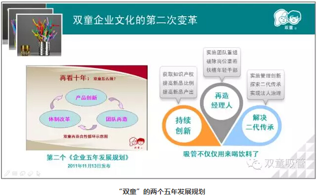 當(dāng)家人樓總答:大家都會(huì)覺得企業(yè)文化很虛,但“雙童”的企業(yè)文化很實(shí)在。比如說標(biāo)語、使命、價(jià)值觀,都落實(shí)到行為當(dāng)中去。“雙童”通過兩個(gè)五年發(fā)展規(guī)劃來實(shí)施。第二個(gè)五年發(fā)展規(guī)劃中的持續(xù)創(chuàng)新,就是企業(yè)的使命和價(jià)值觀,再造經(jīng)理人解決了企業(yè)二代傳承的問題。