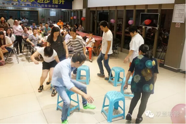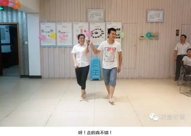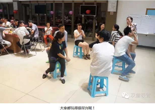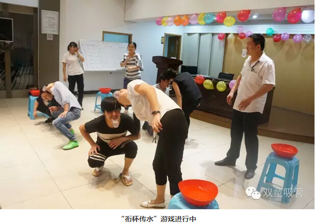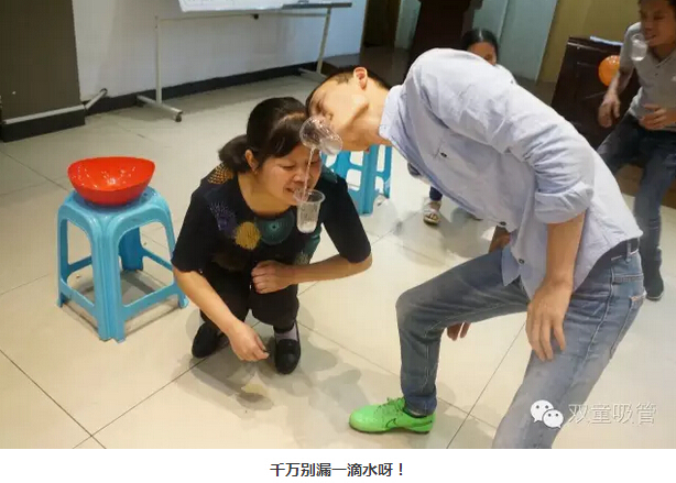 你以為這就結(jié)束了?還沒呢!接下來是重頭戲——“杯中傳情” 。員工們被分為兩隊(duì),在相同的時間內(nèi)用嘴叼杯子傳遞水,途中可不能用嘴哦!游戲好不好玩,看照片你就知道啦!