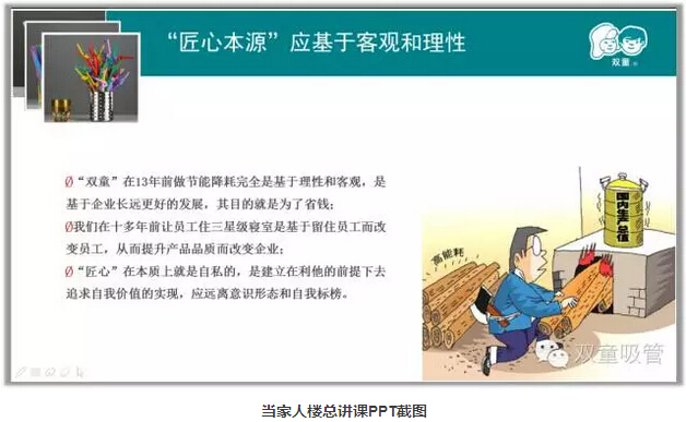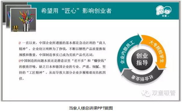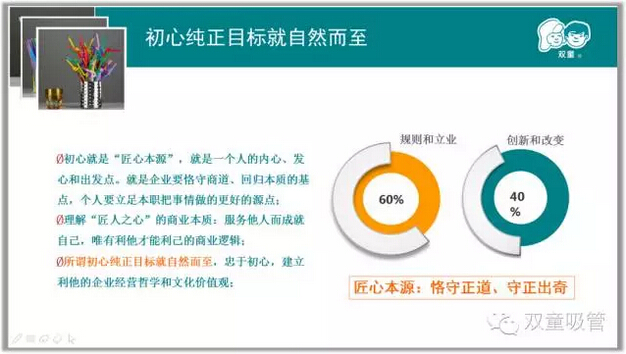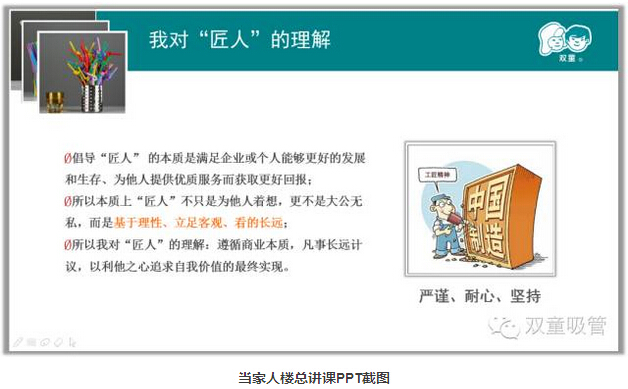 接下來當(dāng)家人樓總分享了用“匠心”經(jīng)營“雙童”的心路歷程,和大家分享了“匠人思維”的三元理解,也就是“三心”——“初心”、“恒心”、”平常心“。