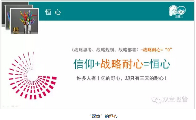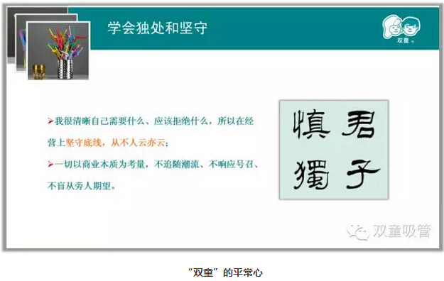 樓總談到自己時說:“一個人一輩子做好一件事就已經(jīng)很了不起了。”做企業(yè)有時候需要“一根筋”,理解“舍得”、懂得“放棄”,學(xué)會享受寂寞和孤獨!“雙童”始終堅持獨處和堅守,從不人云亦云,不被虛名所累,一切以商業(yè)本質(zhì)為考量。
