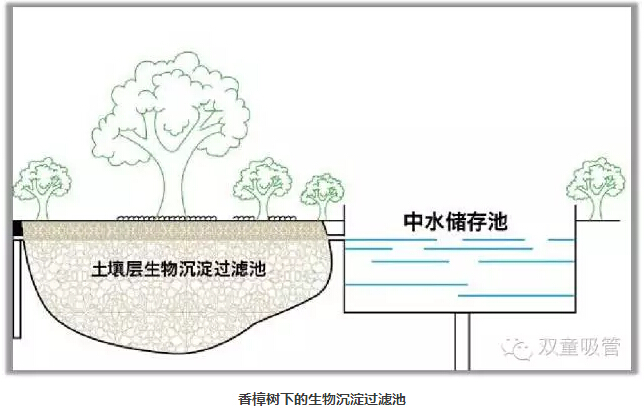 經(jīng)過技術(shù)處理之后的水再匯聚到大香樟樹下的土壤層生物沉淀過濾池,再次進(jìn)行生物吸附處理,通過樹木的根須對(duì)水中的物質(zhì)、養(yǎng)分進(jìn)行吸附,所以這些樹木都生長(zhǎng)的非常好。