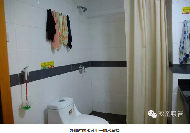 最后經(jīng)過處理的水就已經(jīng)達(dá)到了三類水的標(biāo)準(zhǔn),中水通過設(shè)在池中的抽水泵打到屋頂,專門用于宿舍衛(wèi)生間的馬桶沖水、綠化澆灌和道路清洗。