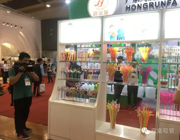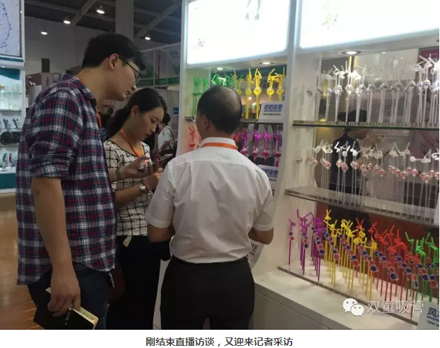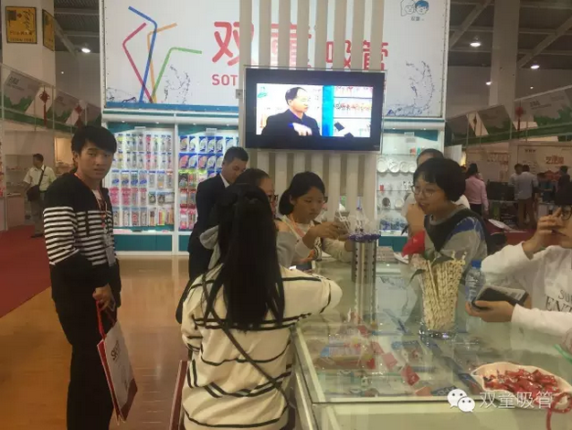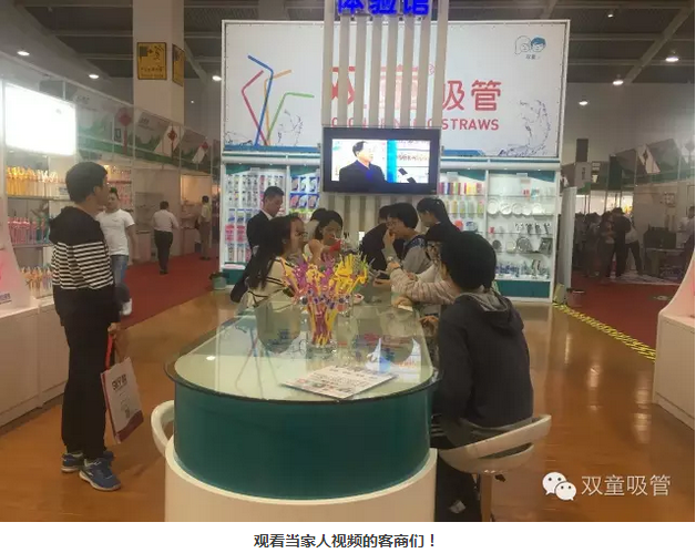 經(jīng)過雙童經(jīng)過的客商基本都會留下腳步。原來是雙童展位的正中央掛著一臺大尺寸的電視機(jī),不間斷的滾動播放當(dāng)家人接受的各類節(jié)目采訪,以及各類媒體對雙童吸管進(jìn)行報(bào)道的視頻!看來咱們當(dāng)家人的魅力還真是大呀!