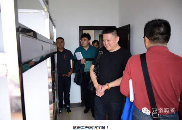 參觀員工寢室時,當(dāng)家人樓總向大家介紹我們的寢室。每個房間都配有干凈整潔的洗手間、寬敞明亮的洗衣陽臺,并配有各種家具,每個房間安裝有空調(diào),24小時供應(yīng)熱水洗澡和純凈飲用系統(tǒng)。就連我們的不銹鋼床,都是我們自己設(shè)計(jì),在建造之初就已經(jīng)焊死在地上,防止員工發(fā)生安全事故的同時,也最大程度上保證了寢室的整潔。
