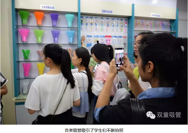 移步樣品房,展柜上陳列著愛心吸管、風(fēng)車吸管、卡通吸管……學(xué)生們看到如此琳瑯滿目的吸管后都十分感興趣,直呼:“一根吸管都有這么多的創(chuàng)意真棒呀!”