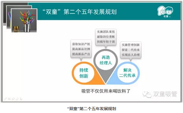 2011年9月,“雙童”又提出了第二個五年發(fā)展規(guī)劃,其中提出了三個關(guān)鍵詞“持續(xù)創(chuàng)新”、“再造經(jīng)理人”、“解決二代傳承”。這些戰(zhàn)略規(guī)劃讓“雙童”的品牌影響力持續(xù)擴大、行業(yè)地位得到持續(xù)提升、成為了綠色環(huán)保的制造業(yè)標桿、社會美譽度和知名度持續(xù)提升,最終形成了鮮明特色的“雙童”文化。