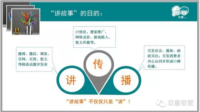 課程開(kāi)始,吸管妞也從“雙童”是如何做自媒體傳播的故事開(kāi)始講起。沒(méi)想到,原來(lái)“雙童”的文化傳播還分為好幾個(gè)階段,從硬廣時(shí)期,到后來(lái)的塑造差異化亮點(diǎn),引導(dǎo)媒體給“雙童”講故事,再到成立文宣部門(mén),形成團(tuán)隊(duì)“講故事”,最后達(dá)到形成企業(yè)文化,形成口碑傳播。“雙童”之所以有今天的文化影響力,與當(dāng)家人樓總的遠(yuǎn)見(jiàn)卓識(shí)是密不可分的!