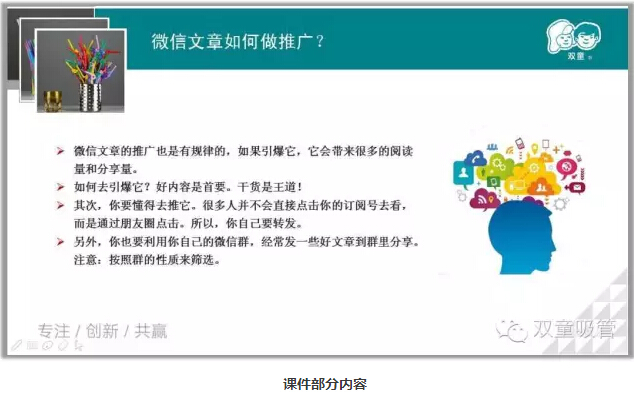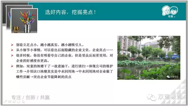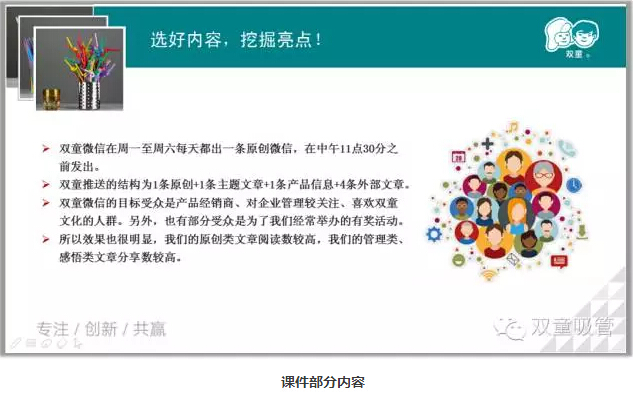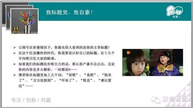 微信也是講故事的一種傳播方式,用微信公眾平臺(tái)作為營(yíng)銷(xiāo)和品牌推廣工具已是眾大企業(yè)和商家的不二之選。那么,究竟如何才能事半功倍地運(yùn)營(yíng)微信公眾平臺(tái)呢?不吹牛的說(shuō),吸管妞經(jīng)常能聽(tīng)到一些朋友對(duì)“雙童吸管”微信公眾平臺(tái)的夸贊,說(shuō)這是義烏企業(yè)界運(yùn)營(yíng)得最好的微信公眾號(hào)。接下來(lái)妞和大家分享在運(yùn)營(yíng)“雙童吸管”微信公眾號(hào)時(shí)所積累的一些經(jīng)驗(yàn),把它們做成PPT分享給大家,共同分享,共同進(jìn)步!