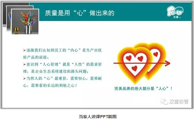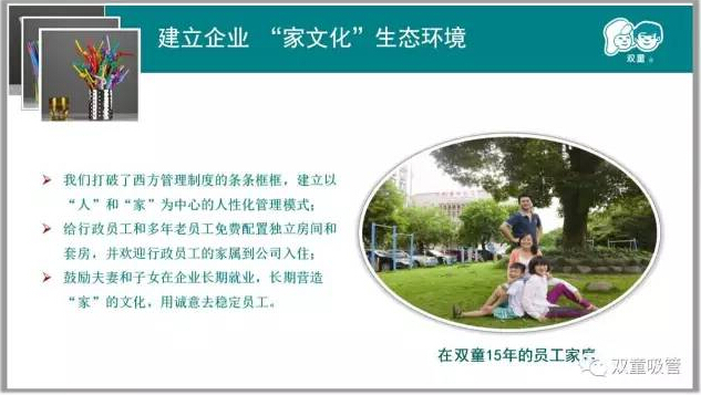 第二章,當(dāng)家人樓總從自身擴(kuò)大到“雙童”團(tuán)隊(duì),談到“雙童”不斷地進(jìn)行硬件改革,給員工提供最好的工作和生活環(huán)境,致力于建立“家文化”,鼓勵(lì)夫妻和子女在企業(yè)就業(yè),解決核心員工家庭生活問題,長期營造“家”的文化,用誠意去穩(wěn)定員工!
