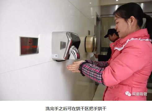 在洗手區(qū),俯身洗手時(shí),你會(huì)看見(jiàn)墻面上溫馨的提示語(yǔ):“洗手臺(tái)盆,保持清潔;請(qǐng)勿將大量的水濺出臺(tái)盆濺濕地面”。洗完手之后,員工可以在烘干區(qū)把手烘干。