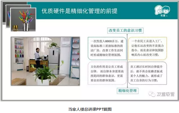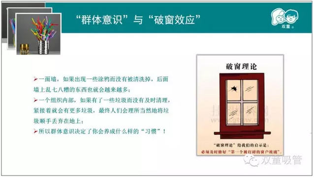 當(dāng)家人樓總常說(shuō)廁所應(yīng)該是一個(gè)企業(yè)最干凈的地方,連廁所都打掃不干凈的企業(yè),怎么可能生產(chǎn)出讓人放心的產(chǎn)品!環(huán)境會(huì)潛移默化地影響員工的素養(yǎng),環(huán)境不好則會(huì)產(chǎn)生破窗效應(yīng)。一個(gè)組織內(nèi)部,如果有了一些垃圾沒(méi)有及時(shí)清理,就會(huì)有更多的垃圾。個(gè)體習(xí)慣依附于“群體意識(shí)”,“群體意識(shí)”決定了你會(huì)養(yǎng)成什么樣的習(xí)慣,員工的習(xí)慣影響著員工會(huì)做出怎樣的產(chǎn)品,因此優(yōu)質(zhì)硬件是精細(xì)化管理的前提,同時(shí)意識(shí)引導(dǎo)也至關(guān)重要!