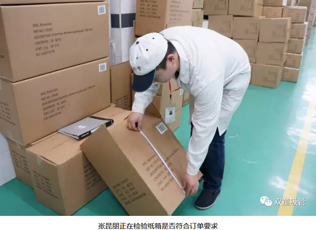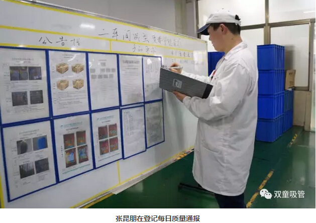 每天,張昆朋都要對產(chǎn)品進行檢驗。從核對訂單開始做起,檢查生產(chǎn)的產(chǎn)品是否符合訂單要求,同時對生產(chǎn)過程中的產(chǎn)品進行檢驗,檢查管子是否有裂口,管子的長度、圓度、顏色等是否符合標準,禁止不合格品流出車間!除此之外,產(chǎn)品有沒有出現(xiàn)多支或少支的情況,產(chǎn)品的包裝袋是否有臟物以及紙箱是否符合訂單要求都要進行抽檢。抽檢結(jié)束后所檢產(chǎn)品要進行數(shù)據(jù)記錄,并在車間質(zhì)量管理看板上登記每日質(zhì)量通報,警醒員工們不要犯同樣的錯誤!他說:“我要確保從我手上出去的吸管是世界上最好的吸管!”