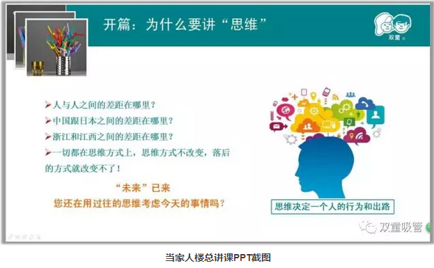 課程開始后,當(dāng)家人樓總闡述了為何要和大家分享“匠人思維”的原因,思維決定了一個(gè)人的行為和出路,思維不改變,落后的方式就改變不了!中國(guó)和日本為何有差距,浙江與江西為何有差距?這些其實(shí)就是思維上的差別,從而影響了一個(gè)地方的發(fā)展。唯有改變思維,才能縮短差距。未來(lái)已來(lái), 我們不能用過(guò)往的思維考慮今天的事情,樓總也希望通過(guò)今天的分享能夠給江西的企業(yè)主們一些啟發(fā)。