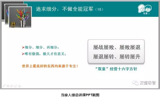 其實(shí)真正把自己的產(chǎn)品做好了,企業(yè)在一定時(shí)候擴(kuò)大規(guī)模才是自然而至!“雙童”的發(fā)展始終伴隨著不斷地放棄,在自己的領(lǐng)域里細(xì)分細(xì)分再細(xì)分,把一根吸管做到極致!在利他的基礎(chǔ)上不斷堅(jiān)持,懂得放棄,關(guān)注事物本身,回歸商業(yè)本質(zhì)!