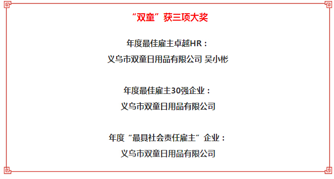 1月10日下午,“我的企業(yè)我的家”2016義烏最佳企業(yè)文化暨“最佳雇主”評(píng)選頒獎(jiǎng)典禮在義烏工商學(xué)院舉行,近百位企業(yè)負(fù)責(zé)人共同見(jiàn)證了義烏新一屆“最佳雇主”的誕生!“雙童”也名列其中,被評(píng)為2016中國(guó)義烏年度"最佳雇主"及“最具社會(huì)責(zé)任雇主”企業(yè),副總吳小彬也被評(píng)為年度最佳雇主卓越HR!其實(shí)“雙童”一直以來(lái)都十分重視員工關(guān)懷,下面妞就帶大家來(lái)看看“雙童”是如何做的吧!