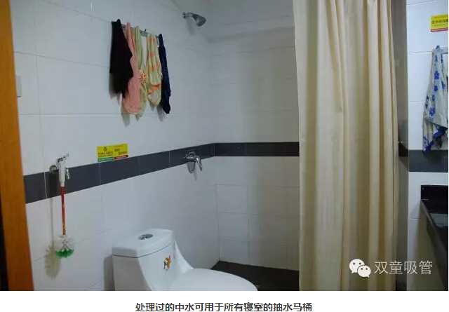 2003年,“雙童”在建設雨水收集系統(tǒng)的同時著力于消滅污染和降低排放,又建設了廢水收集處理及中水回用系統(tǒng),將所有的廢水進行集中處理,并儲存?zhèn)溆谩L幚砗玫闹兴ㄟ^專用管道供應給所有員工寢室衛(wèi)生間內的抽水馬桶、屋頂綠化、綠化噴淋和道路清洗。