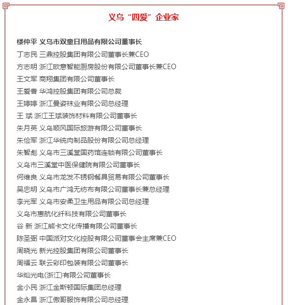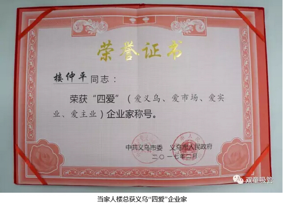 此次的頒獎會由義烏市委書記盛秋平、義烏市長林毅等領(lǐng)導(dǎo)班子親自頒獎。會議頒發(fā)了義烏“四愛”(愛義烏、愛市場、愛實業(yè)、愛主業(yè))企業(yè)家的榮譽(yù)稱號,當(dāng)家人樓總也名列其中,獲得此項殊榮!由于樓總還在外地,這個獎項就由我們的行政副總吳小彬代領(lǐng)啦!