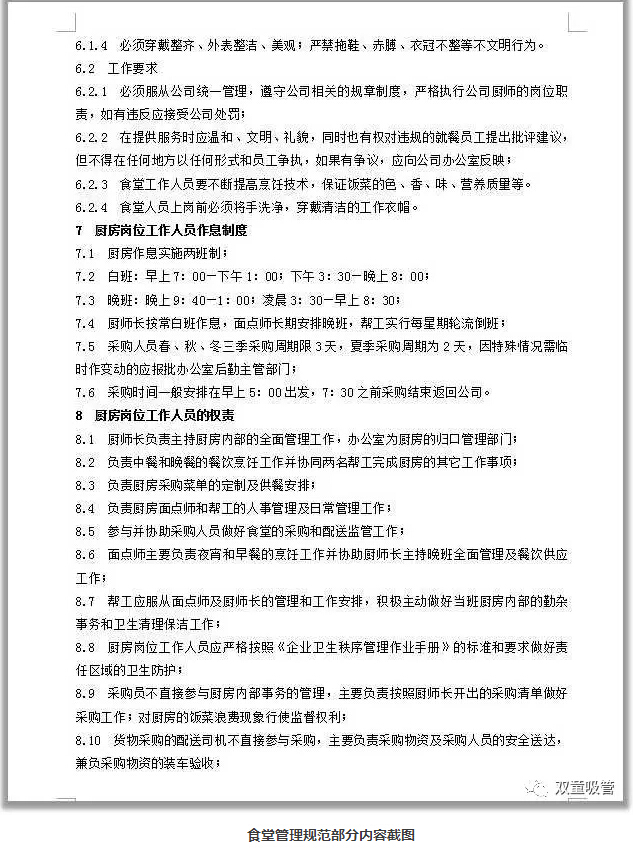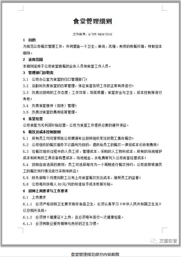 對于餐飲的管理,我們也有一系列的制度文件支撐!從1997年開始,“雙童”就對食堂進行了規(guī)范管理,制定了很多的管理型文件!