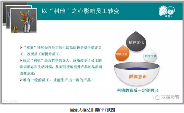 同時“雙童”持續(xù)提升員工生活品質(zhì)其目的不僅僅在于“善心”和“愛心”,也是基于穩(wěn)定員工、改變員工而提升員工!影響產(chǎn)品質(zhì)量的最大要素是人的內(nèi)心,通過“利他”的方式,逐漸改變員工的意識形態(tài)和生活習慣,從而間接地提升產(chǎn)品的品質(zhì)而改變企業(yè)。員工的習慣好了,思想轉(zhuǎn)變了,才能用“心”生產(chǎn)出一流的產(chǎn)品!