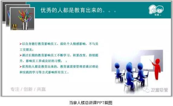 看,當家人樓總的身邊,就坐著二當家李二橋和行政副總吳小彬,無論有什么事,隨時都可以展開溝通和討論,通過言傳身教來影響核心管理層,不僅大大降低了溝通成本,而且也促進了雙方的互相了解,提升了辦事效率。