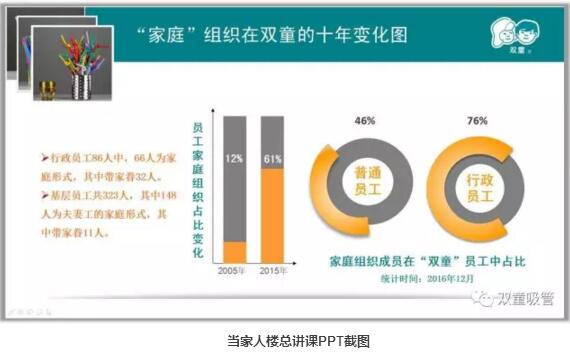 在“雙童”,我們鼓勵員工在公司內(nèi)部談戀愛、結(jié)婚成家、養(yǎng)育小兒、就學安居,公司提供盡力幫助。通過這樣的引導,高達61%的員工都以家庭組織形式存在。當家人樓總說,唯有幫員工解決了家庭問題,員工才不會有后顧之憂,才會卯足勁地為公司奮斗!
