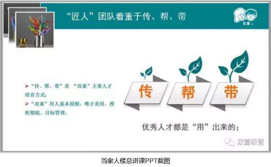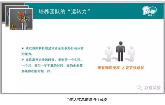 在“雙童”,還有一個讓當家人樓總倍感驕傲的有趣現(xiàn)象。通過長期的規(guī)則和機制建立,“雙童”已經(jīng)有了自動運轉(zhuǎn)的能力。如果當家人樓總不在公司,不會有任何員工打他的電話詢問工作應該如何決策。哪怕樓總外出旅游兩三個月,公司也照常運轉(zhuǎn),不受任何影響。當家人樓總也對管理層放話:唯有對你們徹底授權(quán),你們才會成長得更快!