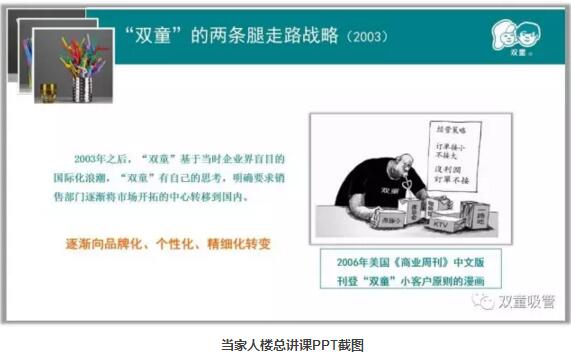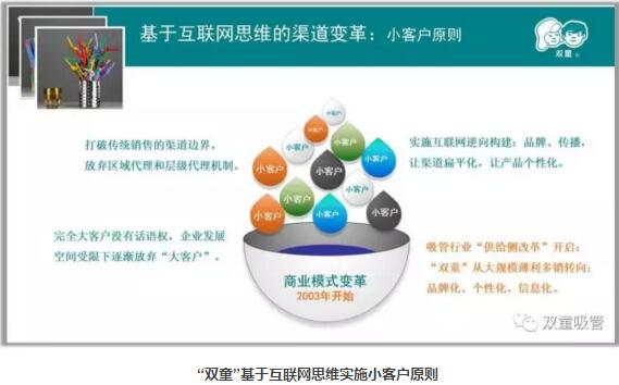 “雙童”是一家互聯(lián)網(wǎng)創(chuàng)新企業(yè),也是中國(guó)第一批使用互聯(lián)網(wǎng)尋找商機(jī),聯(lián)絡(luò)客戶的企業(yè)!2003年,“雙童”基于互聯(lián)網(wǎng)思維實(shí)施了小客戶原則,逐漸放棄“大客戶”,打破傳統(tǒng)銷售的渠道邊界,實(shí)施互聯(lián)網(wǎng)逆向構(gòu)建:品牌、傳播,讓渠道扁平化,產(chǎn)品個(gè)性化!