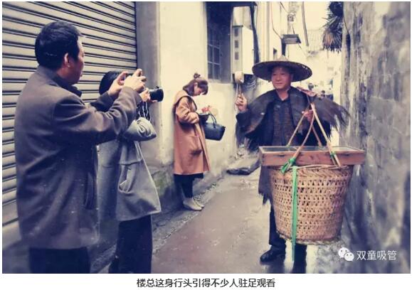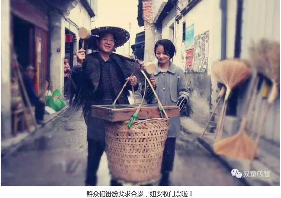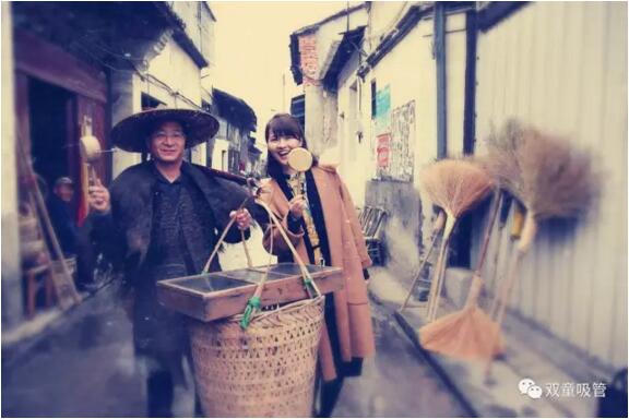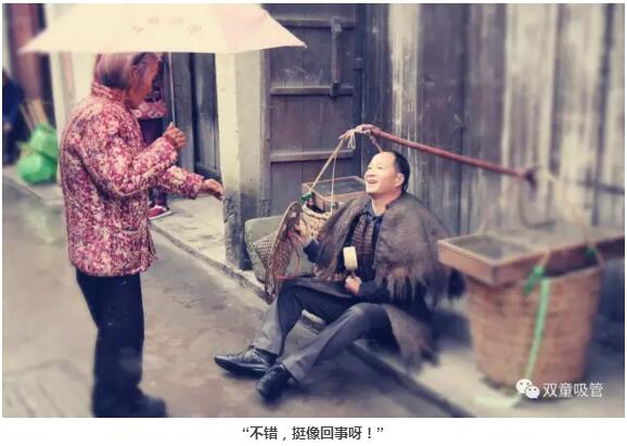 原來,這是應(yīng)中國義烏網(wǎng)的記者要求,當(dāng)家人樓總在給最近大火的電視劇《雞毛飛上天》拍攝宣傳海報呢!我們特地驅(qū)車到義烏“雞毛換糖”的發(fā)源地廿三里,當(dāng)家人樓總重拾三十多年前的舊業(yè),走街串巷換雞毛嘍!