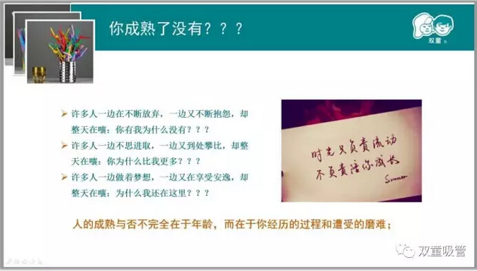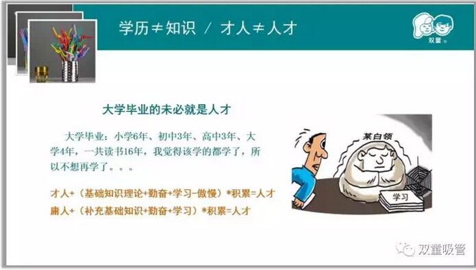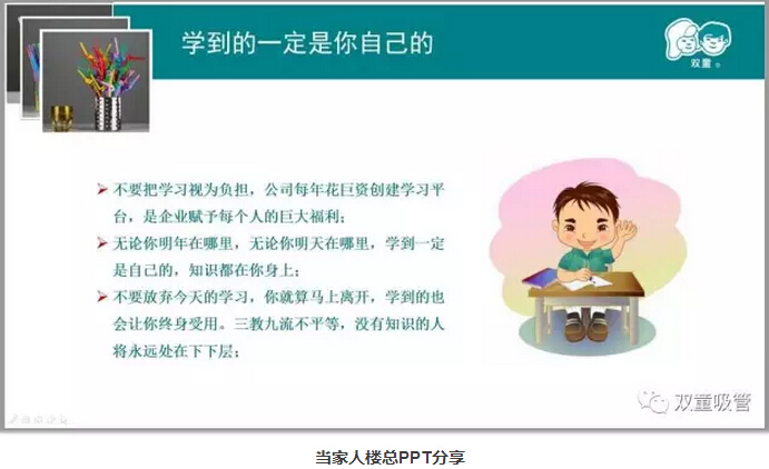 學(xué)歷≠知識、才人≠人才,樓總也鼓勵大家,一定要堅(jiān)持學(xué)習(xí),學(xué)習(xí)并不是學(xué)校里才需要做的事!如果工作以后就不思進(jìn)取,不學(xué)習(xí)提升,就算是博士生,“雙童”也不會對你敞開大門!而對于那些肯學(xué)習(xí)、肯鉆研的員工,“雙童”會提供非常多的學(xué)習(xí)機(jī)會和提升空間,讓你在“雙童”有一個更好的發(fā)展!就算有一天你離開了“雙童”,你學(xué)到的始終是你自己的!