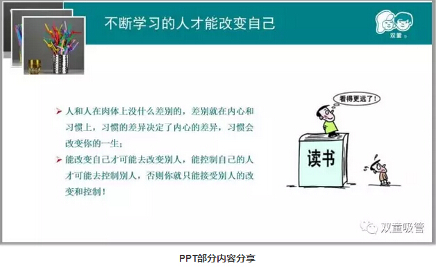 最后,妞也分享道:“無論你在哪里,都不要放棄今天的學習,學到的一定是自己的,也會讓你終身受用,只有不斷地學習才能改變自己!” 有的人會說,學習是很枯燥的。但是吸管妞覺得,通過不斷地探索改革,“雙童”的學習會,卻越來越熱鬧,越來越快樂……