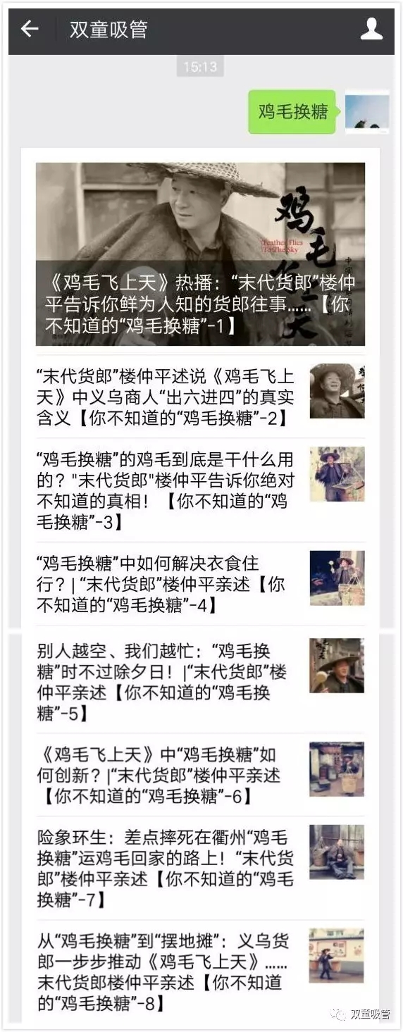 步驟二:點(diǎn)擊發(fā)送后,系統(tǒng)會(huì)自動(dòng)回復(fù)《你不知道的“雞毛換糖”》文章系列!