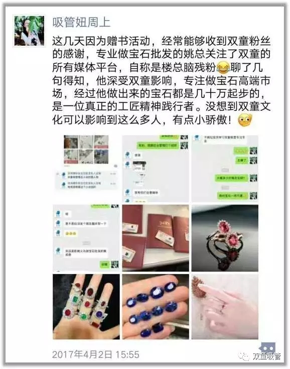 比如說(shuō),有一位做寶石批發(fā)的粉絲,不僅關(guān)注了“雙童”的所有媒體平臺(tái),自詡是當(dāng)家人樓總的腦殘粉,而且真真實(shí)實(shí)地將“雙童”文化融合入自己的創(chuàng)業(yè)經(jīng)營(yíng)中。他說(shuō),自己深受“雙童”文化影響,拒絕劣質(zhì)低價(jià),專(zhuān)注做高端寶石,從他的雙手中做出的寶石都是幾十萬(wàn)起步,真是身體力行地在實(shí)踐工匠精神吶?。ㄦ?nèi)心os:我們的粉絲怎么這么壕!)