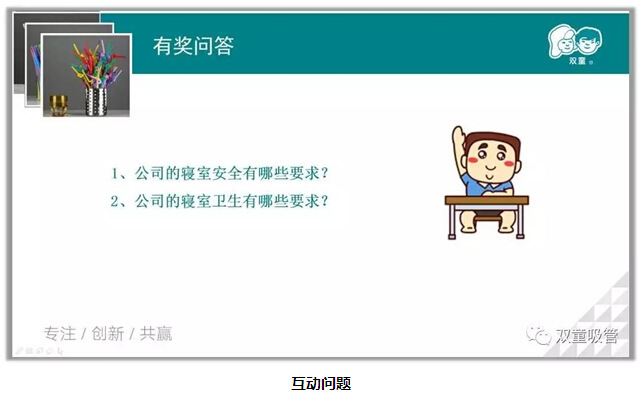 張講師一開場就介紹了各類寢室的配置及安排補(bǔ)貼原則。瞧瞧!員工們聽得多認(rèn)真呀!一到了問答環(huán)節(jié),個個都很積極呢,公司的寢室分為哪幾種?具體又是怎么安排分配的?員工們都對答如流,直呼咱們“雙童”的居住環(huán)境真的很棒!是呀,“雙童”的寢室建立之初就按照三星級酒店的標(biāo)準(zhǔn)裝修,讓員工們能夠住的開心住的舒心!