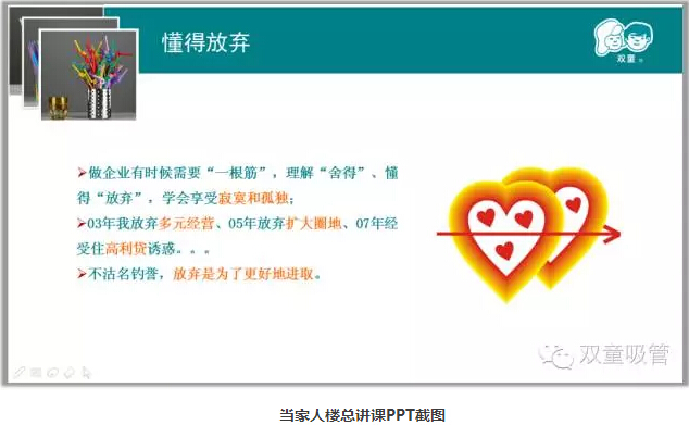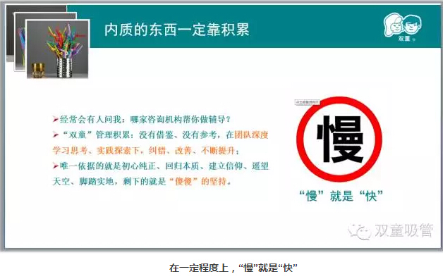 在全球經(jīng)濟形勢并不樂觀的大背景下 ,不少企業(yè)遭遇著生存困境,有的甚至面臨倒閉。吸管妞研究后發(fā)現(xiàn),大部分陷入困境的企業(yè)都有一個共同點,就是擴張速度過快或者過度多元化。而在“雙童”發(fā)展過程中,“雙童”樓仲平一直倡導做企業(yè)要“慢”,不可貪大求全,更不能為了尋求快速發(fā)展而投機取巧。樓仲平經(jīng)常說,在一定程度上其實“慢”就是“快”!今天吸管妞就和大家一起來理解這個觀點!