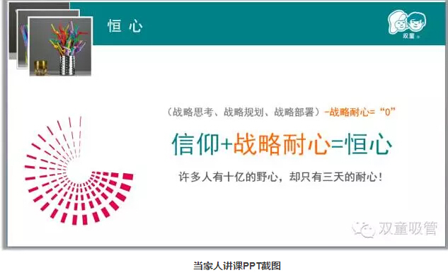 但一部分企業(yè)選擇了專注于自己的產(chǎn)品,專注于自己的行業(yè)。其實“雙童”一開始也想做許多產(chǎn)品,走過許多彎路。后來,逐漸認知到問題所在,逐漸放棄了多元化、放棄大客戶、放棄投資、抗拒誘惑……選擇了堅持與專注,回歸一根吸管,最終把一根小小的吸管做到了極致,做到了吸管行業(yè)的領(lǐng)導者!