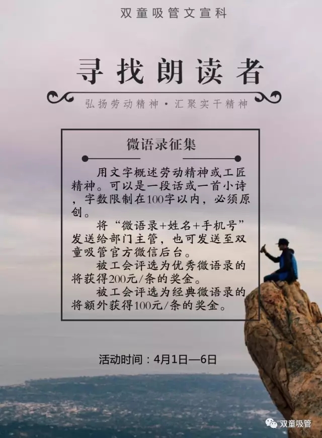 前段時間,義烏市總工會舉辦了“弘揚勞動精神·匯聚實干力量”尋找朗讀者活動,征集以勞動精神、勞模精神或工匠精神為主題的微語錄。吸管妞一看到此次活動,就覺得這樣的活動太適合“雙童”人啦,立馬就報名啦!