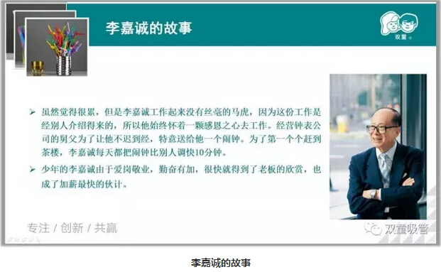 我們都應該心懷感恩之心,用感恩的心去工作。妞也用李嘉誠的案例故事和童鞋們進行分享:“李嘉誠在茶樓當伙計時,每天天未亮就出去工作,盡管每天工作時間長達15小時,也不會絲毫的懈怠馬虎,始終懷著一顆感恩之心去工作。在隨后的創(chuàng)業(yè)過程中,懷著感恩之心開創(chuàng)了屬于自己的事業(yè),成為華人首富。”李嘉誠的事例說明,感恩和敬業(yè)可以最大程度的激發(fā)一個人的潛能,使之迅速在職場中脫穎而出,無論你從事什么工作,都要牢記,用心者事競成!