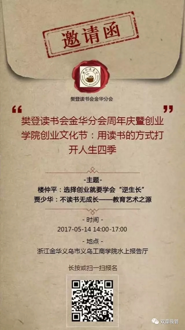 當(dāng)然,如果你也對樊登讀書會有興趣,或者還有些許猶豫和疑問,沒關(guān)系!吸管妞送上驚喜福利,誠摯邀請大家免費參與5月14日(本周日)在義烏工商學(xué)院水上報告廳舉辦的樊登讀書會金華分會成立一周年慶典活動,我們“雙童”樓仲平也會參與盛典,與義烏工商學(xué)院賈少華院長進(jìn)行專場分享!如果你是樓總的粉絲,更要參加此次盛會哦?。?/span>識別圖中二維碼即可線上報名哦?。?/span>